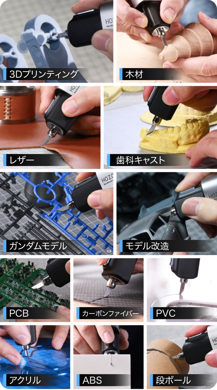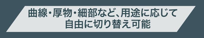 ストレート・カーブ・チゼル(ノミ型)・細刃など、素材や形状に応じて最適な刃を自由に切り替えることが可能です。