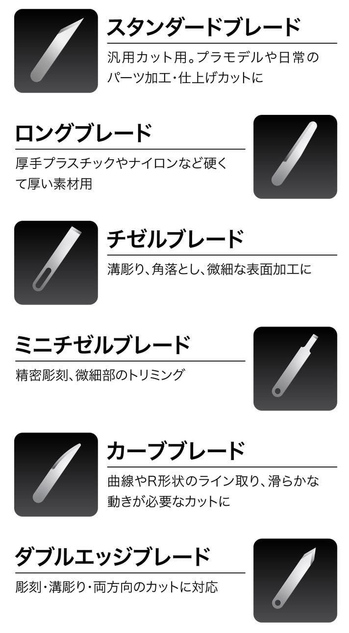 (ロングブレード, チゼルブレード, ミニチゼルブレード, カーブブレード, ダブルエッジブレード全5種類から選択)