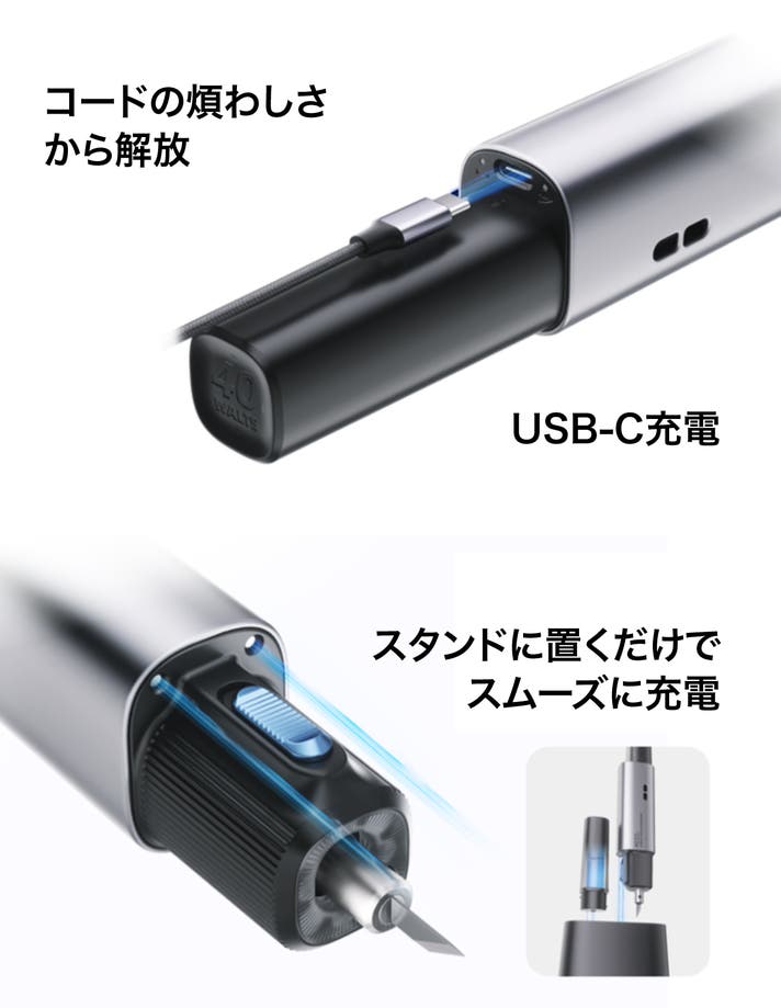 さらに、本体をスタンドに置くだけで自動で充電が始まる「置くだけ充電スタンド」を採用。