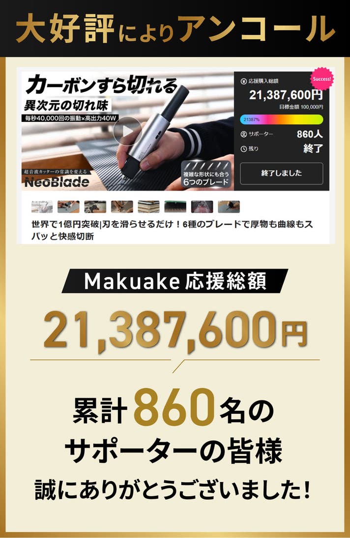 「Makuake(マクアケ)」は、実行者の想いを応援購入によって実現するアタラシイものやサービスのプラットフォームです。このページは、 プロダクトカテゴリの 「【アンコール】世界で1億円突破 | 6種のブレードで厚物も曲線もスパッと快感切断」プロジェクト詳細ページです。