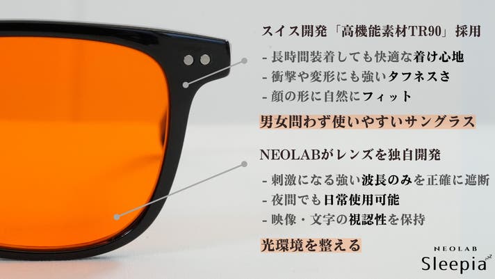 NEOLAB Sleepia サングラスのフレームには、スイス開発の高機能素材TR90(グリルアミド)を採用。