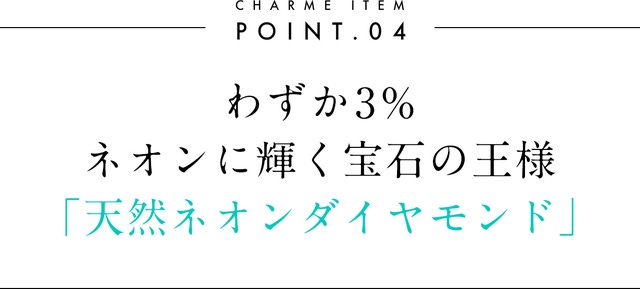 綺麗なネオンカラーに輝く天然ダイヤモンド「ネオンダイヤモンド」は、数あるダイヤモンドのわずか3%のみの特別な存在で、通常では手に入らない希少な宝石で、女性をさらにさらに美しく、楽しませてくれます。