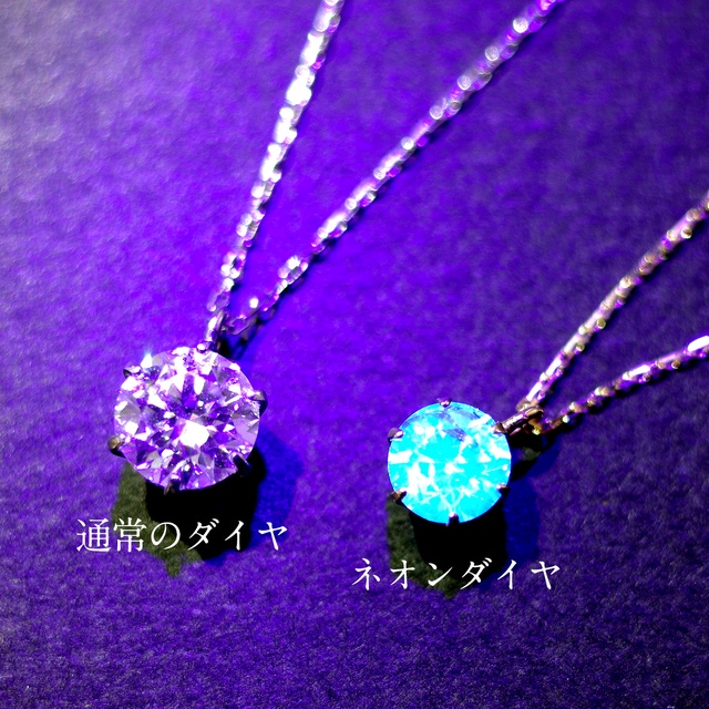 蛍光性のあるダイヤモンドは普段は通常のキラキラした輝きのダイヤモンドですが、光を当てると突然、綺麗なネオンカラーに輝きます。