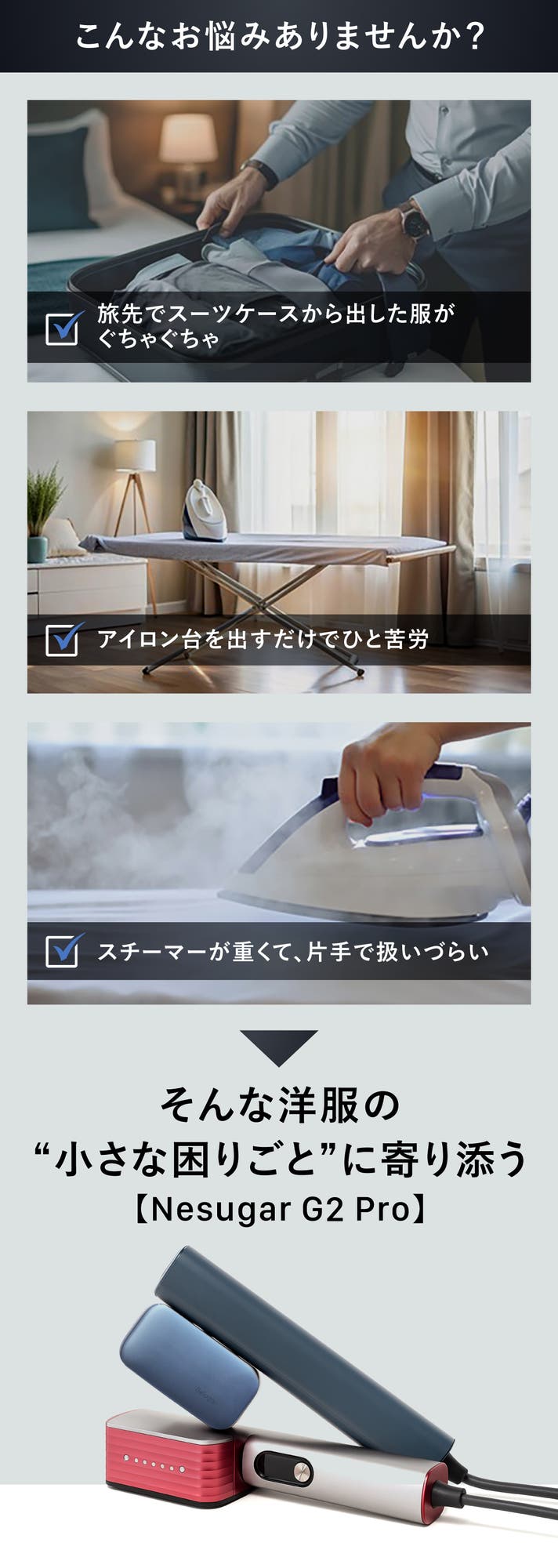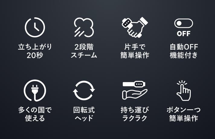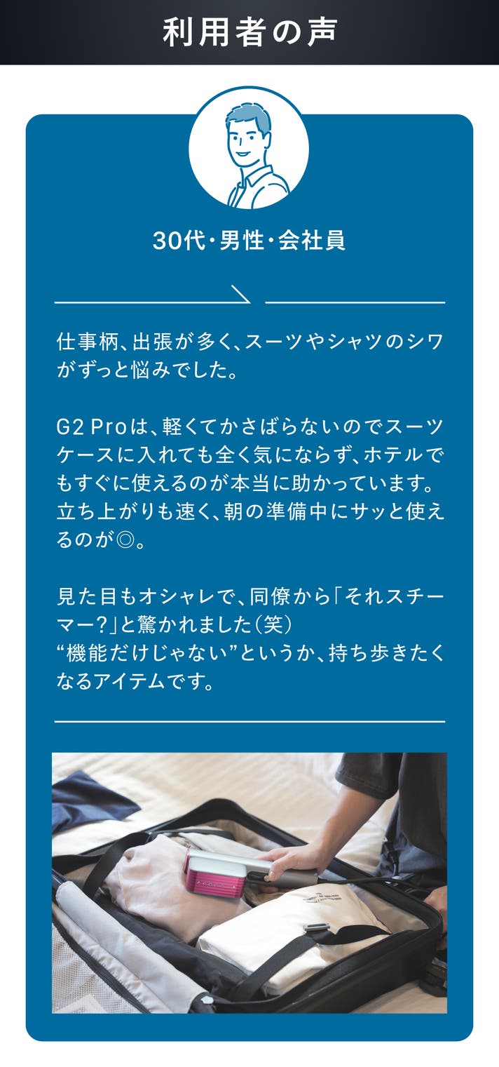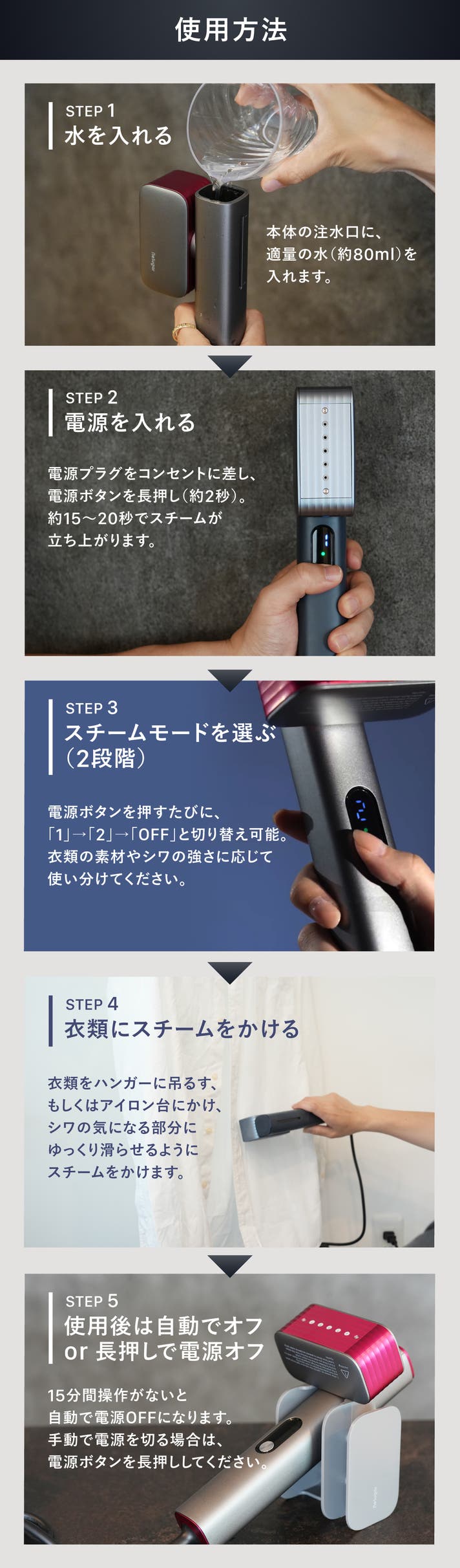 - 出張・旅行・休暇など、外出先での衣類のシワ悩みを解決する、超軽量ポータブルハンドスチーマー。