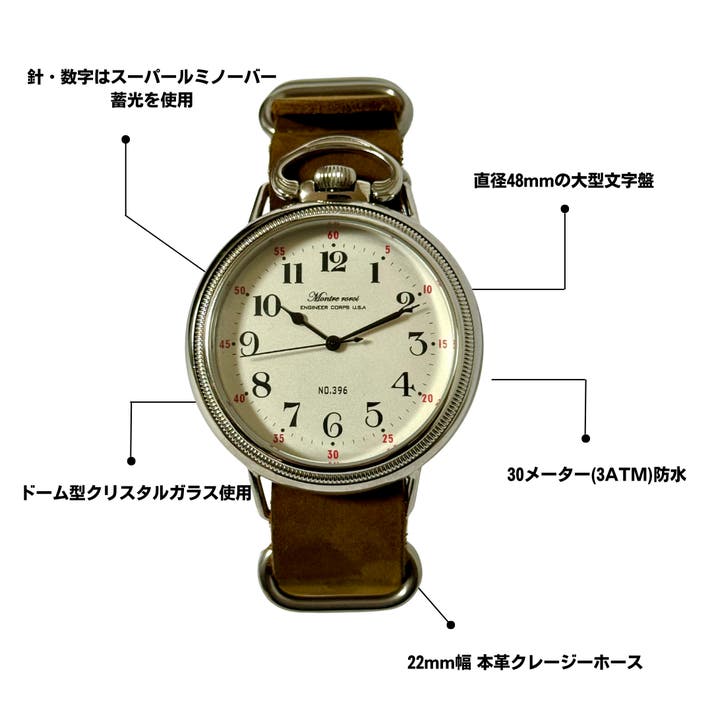 - 実存した米軍懐中時計をサファイアガラス採用で、時を超え輝きを維持