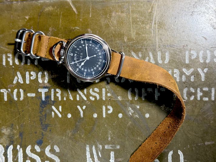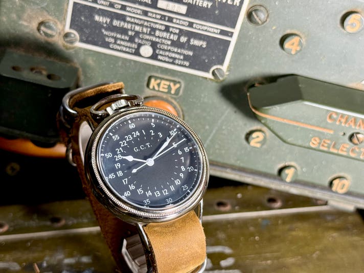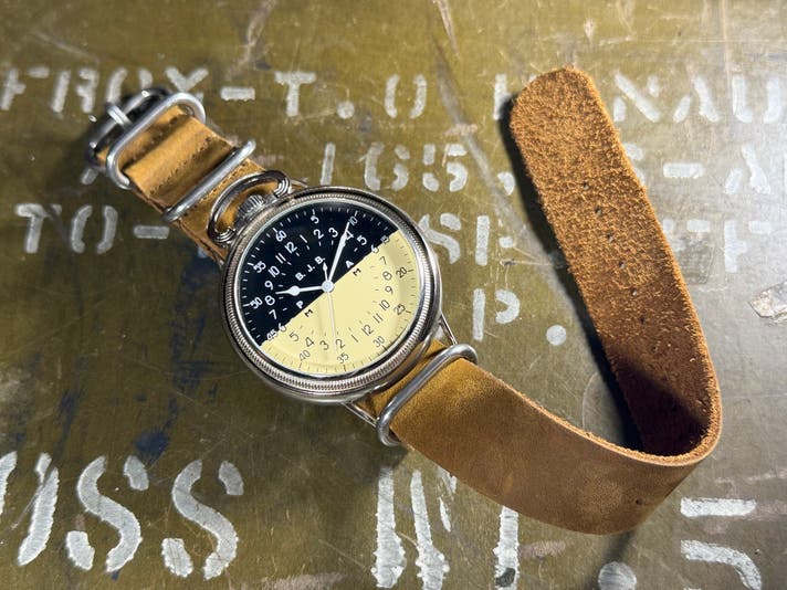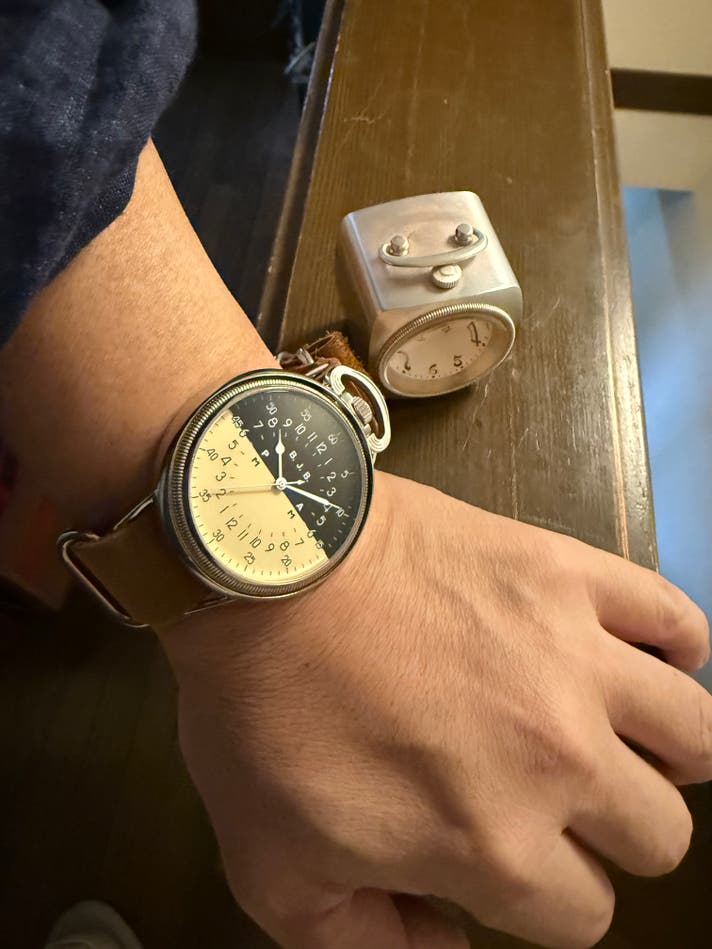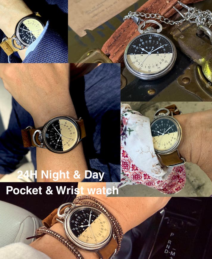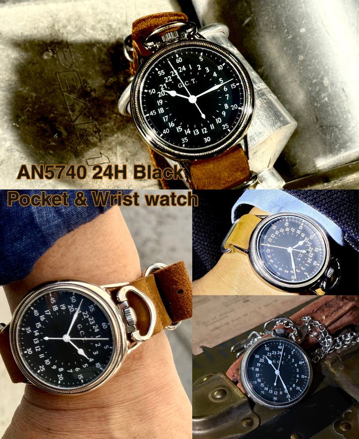 米軍ナビゲーション・ウオッチの中でも黒文字盤のAN5740とは異なり、本当に僅かな数しか現存しないマニアの中でも「幻」と言われている文字盤の復刻になります。とても希少で離長距離戦略爆撃に向かうほんの一部の飛行機乗り達に支給された事だけは間違いないようです。24時間のダイヤルを白黒(クリーム色と黒)で塗り分ける事により視認性が高く、直感的に午前午後を把握できるデザイン的にもすぐれた文字盤です。