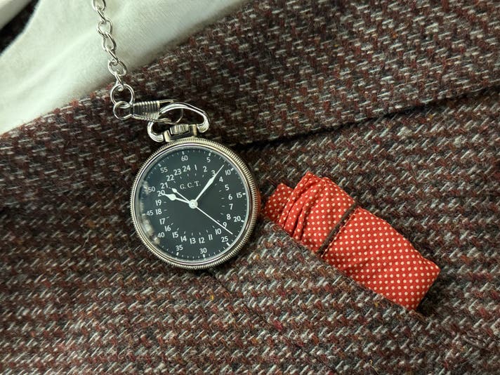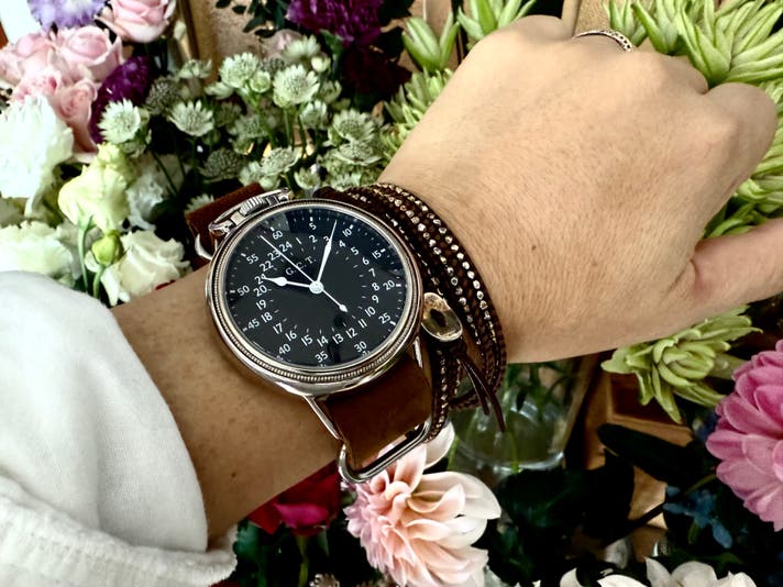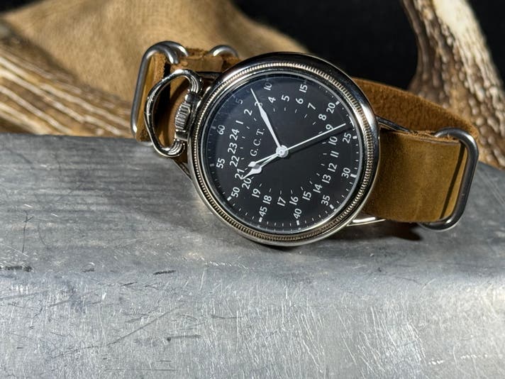 時字は内側に1-24時間表記になっていて外側に秒字が5秒刻みで記されています。スイス・ロンダ社のムーブメントを使用しています。文字版に記されているG.C.Tは(Greenwich Civil Timeグリニッジ標準時の略).。大きな文字版なので24時間時計でも時間が読みやすいです。