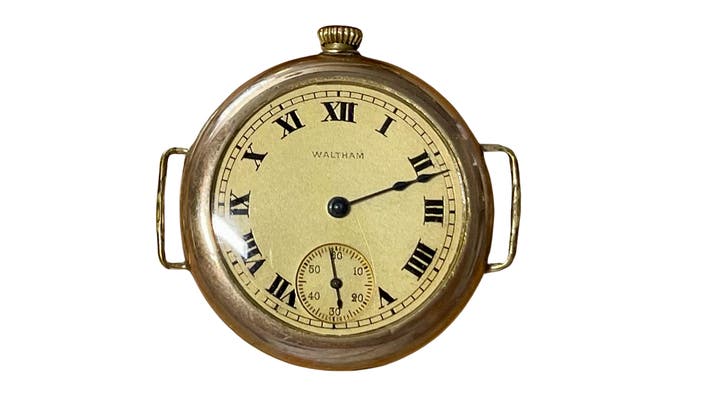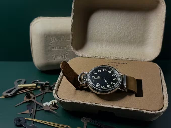 実はクラウドファンディング市場と一般販売では人気のアイテムが異なるのです。一般市場ではこの文字盤が一番人気です。実際使われていた米軍に属する一般看護婦に支給されていた小型のポケットウォッチをAN5740ケースにはめ込んでみました。