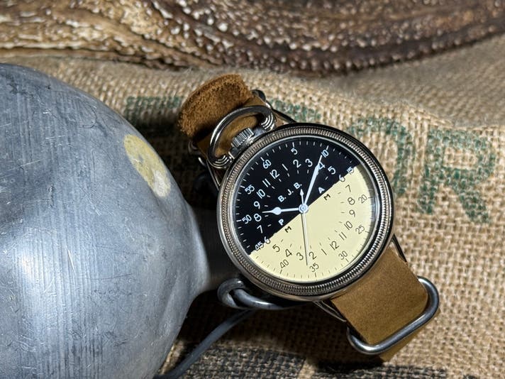大きな文字盤なので24時間時計でも時間が読みやすいです。文字盤に記載されているB.J.Bは未だ正確な事がわかっておりません。「ベルリン・ジャパン・ボマー」と云う戦略爆撃部隊にちなんだものと言う説もあります。
