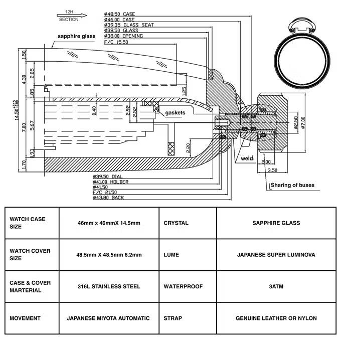 12時間自動巻きムーブメント:国産・MIYOTA製 ・携帯頻度(常温):平均日差-20〜+40秒