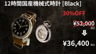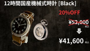 完成した『12時間国産機械式時計 Black』x 1個、『時計カバー』 x 1個、『22mm幅牛革クレージーホース』x 1個、保証書付