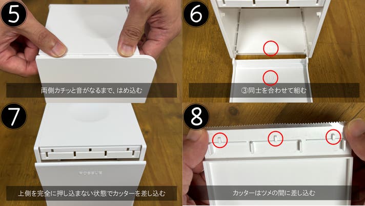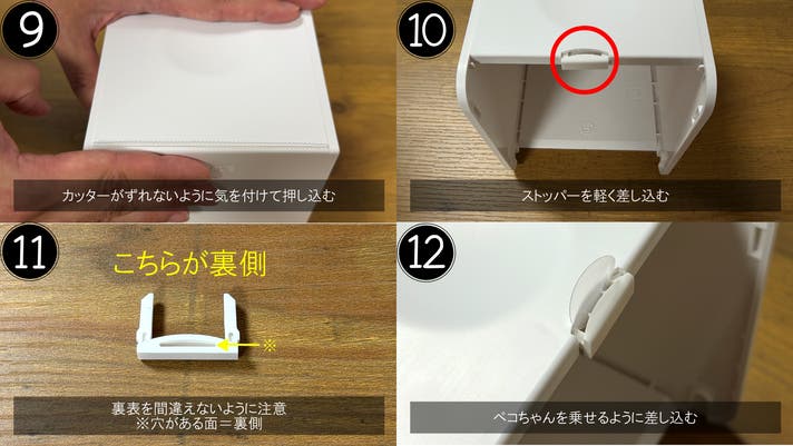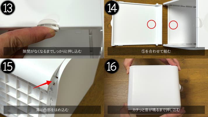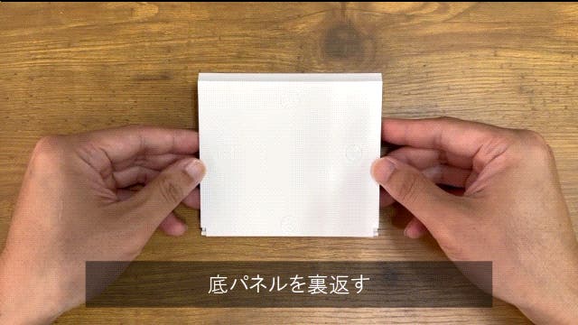 最後にe.リヤパネルをbc.サイドパネル左右双方にある溝にe.リヤパネルの凸部を挿入してください。この時d.フロントパネルを下面にしていただき⓯のように押し込んでいただくと入れやすいです。ペーパーを入れたら完成です。