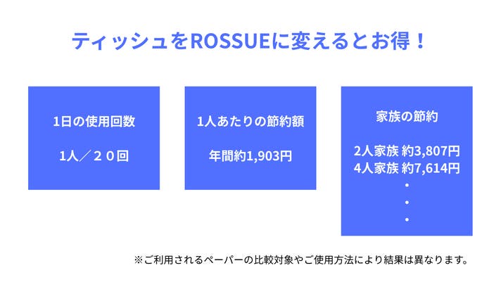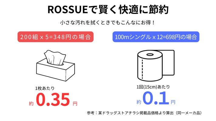 ROSSUEなら中身がロール(トイレット)ペーパーなので、必要な分をサッとカット。無駄をなくし、必要な分だけ使うことができます。