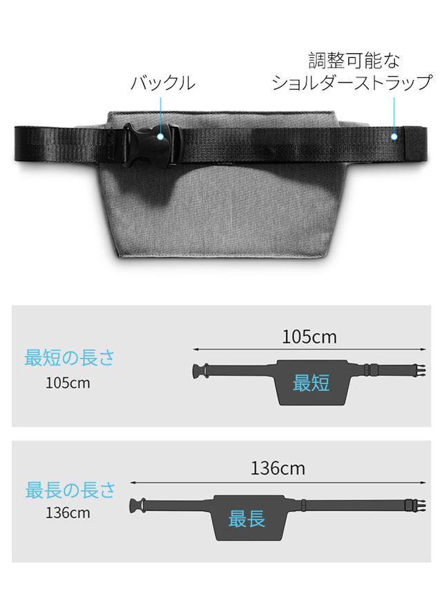 外側のファスナー付きポケットと、ファスナー付き本体ポケットの2部構成で、小さなボディながらも大容量でスムーズな出し入れが可能です!長さ調節が可能なため、性別や年齢を問わず使用可能です。
