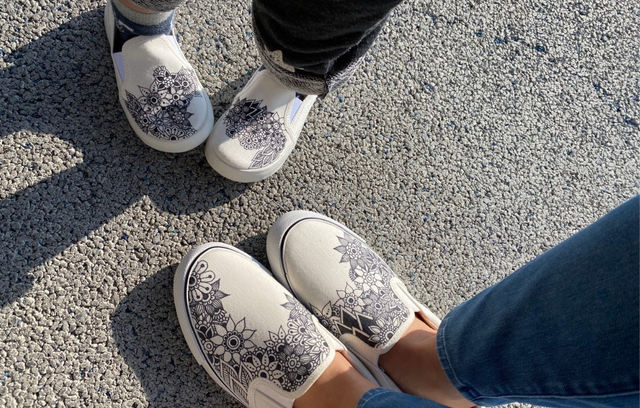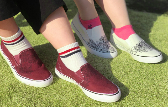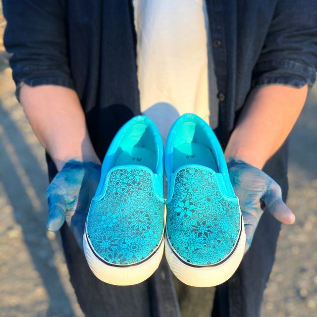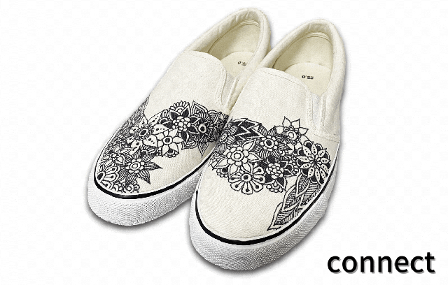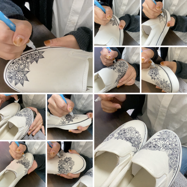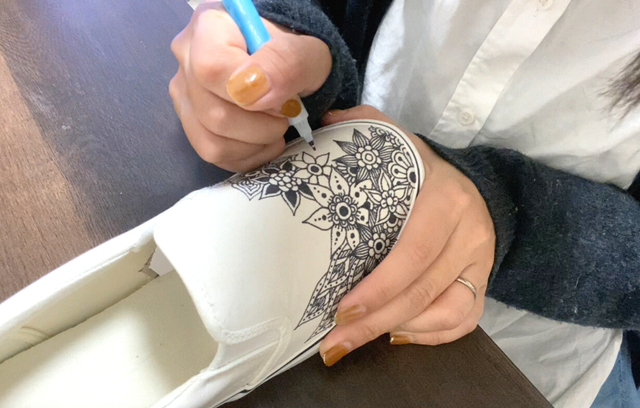 - 柄を描く先は今までの活動で人気が高かったスニーカー。長く履けるようにペンと仕上げにこだわりも。