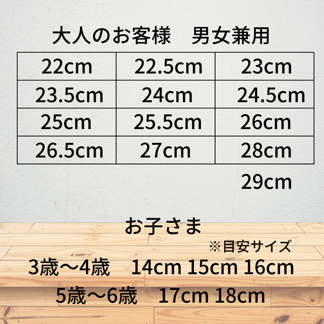 サイズはユニセックス、22cm〜27cmまでは0.5cm間隔、27cm〜29cmは1cm間隔です。お子さまのサイズ目安はこちら。