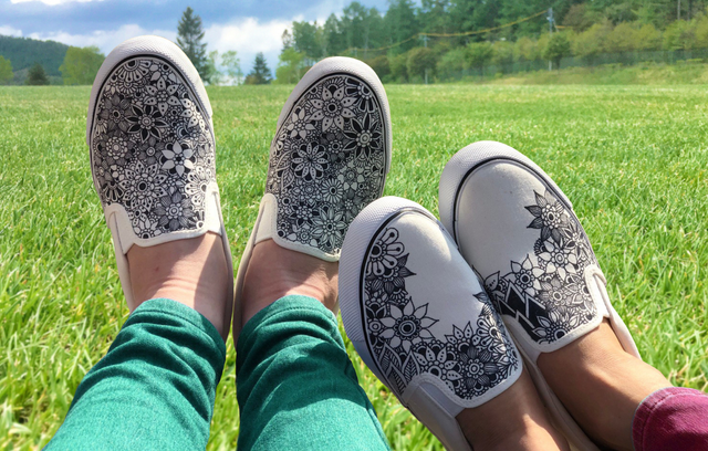 スニーカーに集合体アートを手描きしていく作業は、ご購入後のお手入れも考え、洗濯に強い布書き用油性ペンを使って行います。