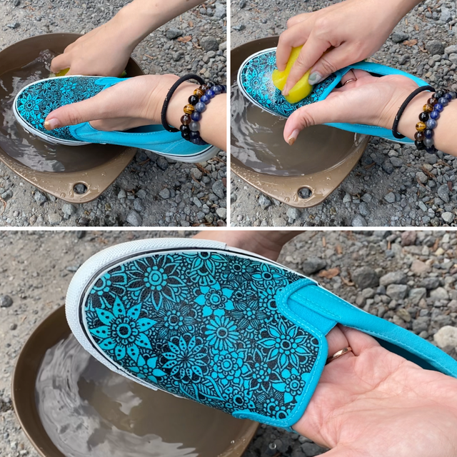 実は、強めに洗っても色も柄も落ちません。長く保たせるためには、汚れが軽いうちに水で洗って頂き、乾いた後に防水スプレーをかけておくだけで色も柄も長持ちします。
