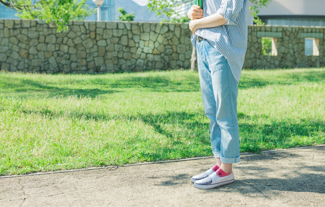 2年間、履き続けてくださったお客様のお写真をご覧ください。丈夫な素材のため色落ちしてもいい味わいで楽しんで頂けます。