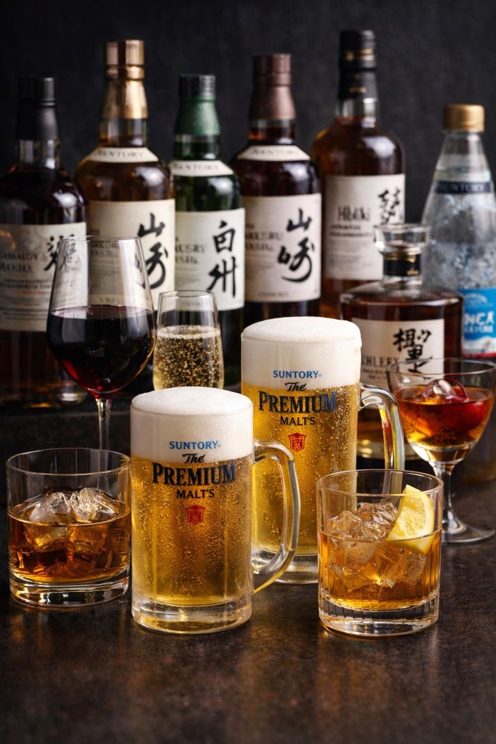 ※プレミアムのフリーフローは別途ご注文可能。日本酒もニューミート自慢の各銘柄の他、山崎や白州などの国産ウイスキーも多数ご用意させていただきます。また、ワインがお好きなお客様もボトルで単品追加できるようケンゾーエステイト等、高級銘柄を中心に揃えております。