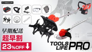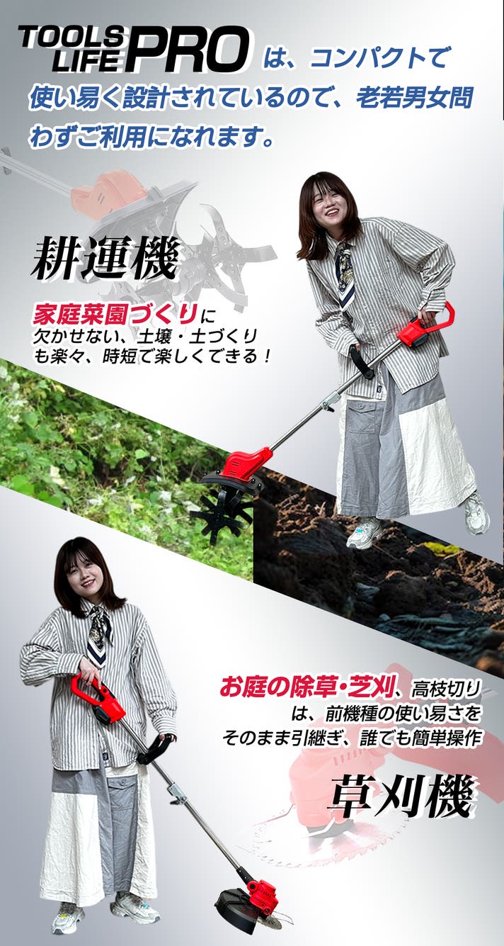 草刈機と耕運機の機能を一台に集約した"TOOLS LIFE PRO"は、ご自宅のお庭の手入れから、本格的な家庭菜園づくりまで、一台二役で皆様のガーデニングライフを強力にサポートします。