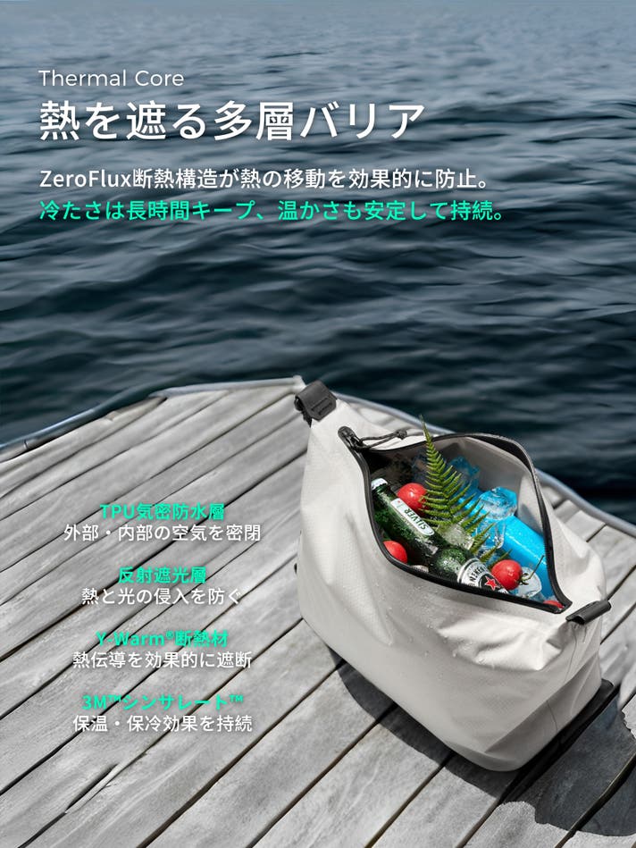 従来の保冷バッグにあった「重くて硬い」あるいは「軽いけれど保冷力が弱い」といった印象を一新。完全防水・6L容量ながら、重さはわずか234g。缶1本の2/3ほどの軽さで、通勤ランチや都市でのピクニック、軽登山やキャンプまで、どんなシーンにも軽快にフィット。冷蔵庫がない場所でも、飲み物や食べ物を安心して保冷できる自由を。