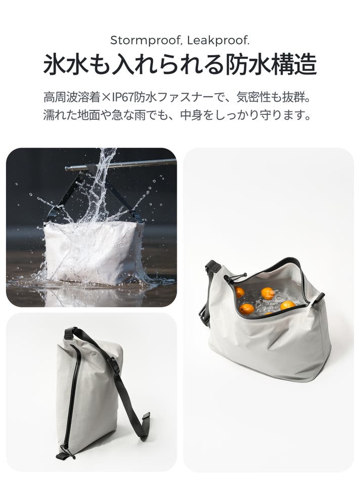 湿気の多い天候でも、漏れの心配なく、思いきり楽しめる設計。縫い目のない高周波溶着加工 × IP67相当の気密防水ファスナーを採用し、液体の滲出を防ぐための工夫あり。氷水を直接入れても、バッグを横倒しにしても、他の荷物と一緒にパッキングしてもOK。海辺の強風や急な雨にも動じず、外はドライ、内は安心のまま、どこまでも一緒に。