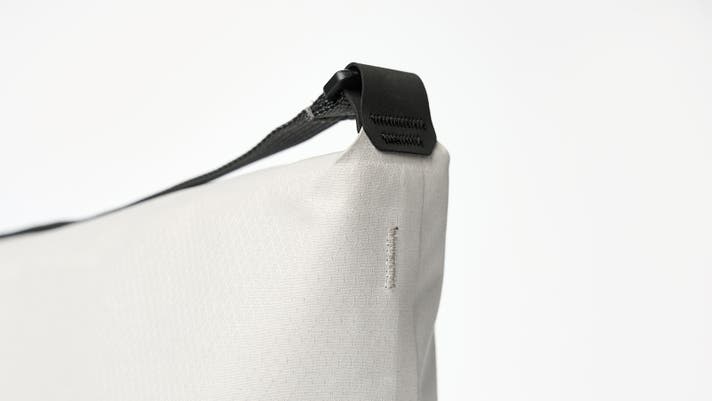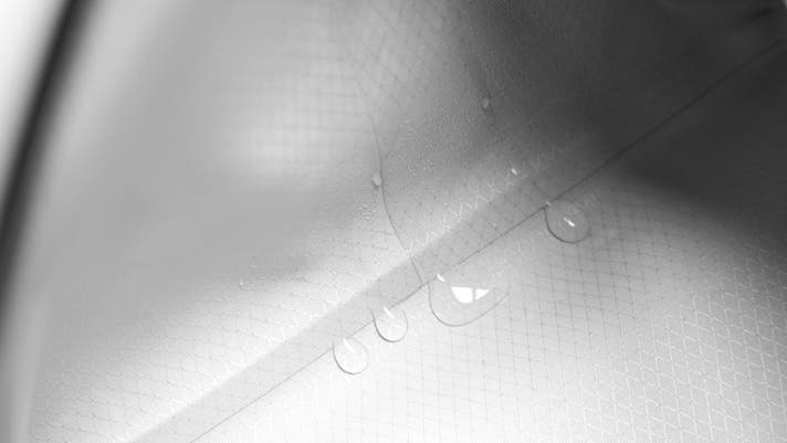 一見シームレスな外観は、高精度の溶着加工と専用金型によって実現。精密な調整により、気密性・防水性・耐久性を確保。高密度ファブリックにTPUとPUの複合加工を施し、耐穿刺性と構造安定性も向上しています。