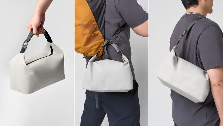 厚みのあるやわらかいハンドル付きで、手持ちも快適。バックパックの外側に引っ掛けたり、ショルダーとして肩掛けも可能。用途やシーンに合わせてストラップの長さを調整できる、自由度の高い設計。
