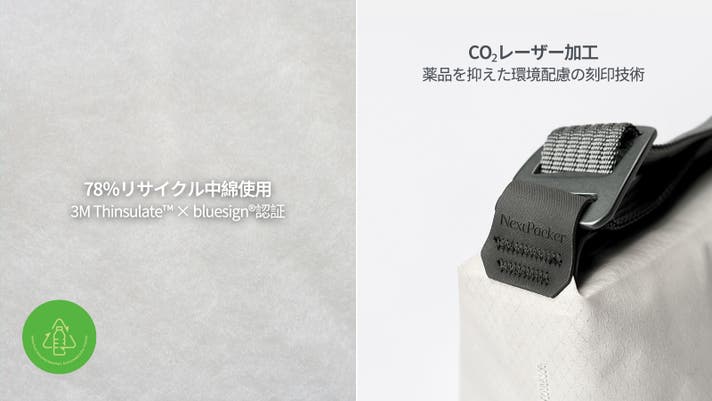 中綿には、78%リサイクル素材を使用した3M™ Thinsulate™ 保温材を採用。ブルーサイン(bluesign®)認証を取得した、環境にやさしい高機能中綿素材。ハイパロン製部分には、プリントではなくCO₂レーザー彫刻技術を採用。化学薬品の使用を抑え、より環境に配慮した加工方法を実現。