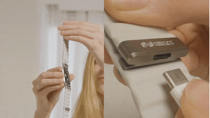 NEXXT PERCENTは、極薄ワイヤレス充電モジュールをバンドに内蔵しているため、別途ワイヤレス充電器を持ち歩く必要がなくなりました。
