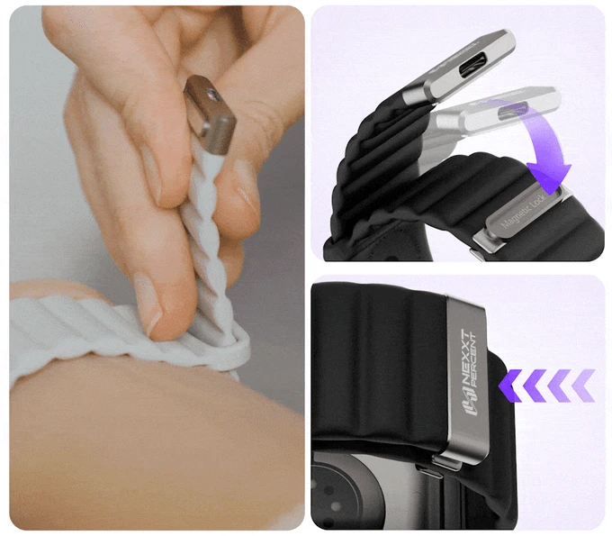 今回はメーカーと連携し、2-in-1 Apple Watch充電バンド「NEXXT PERCENT」のプロジェクトをMakuakeにて展開いたします。このバンドを使用すると、USB-C ポート経由で Apple Watch を簡単に充電できるため、別途ワイヤレス充電器を用意する必要がなくなります。耐久性と柔軟性に優れた液体シリコン素材を採用し、波形デザインにより通気性を高め、運動時でも快適な装着感を実現します。一日中使用できる機能性と快適性を兼ね備えた製品です。