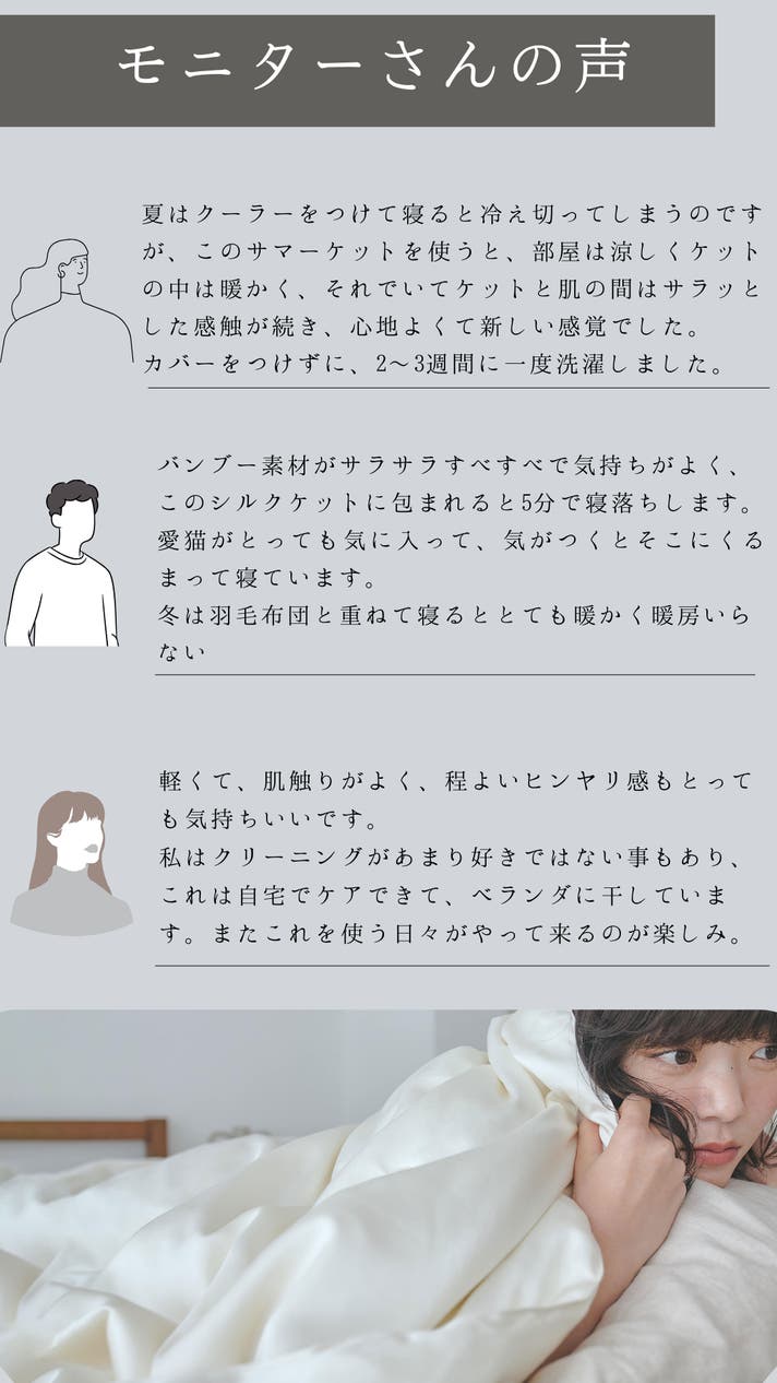 ◾️シルクだとお手入れが大変?クリーニングしないとダメ?と思いますが、今回のサマーケットはご自宅で手洗いができちゃいます。常に清潔で気持ちよくお使えいただけます。