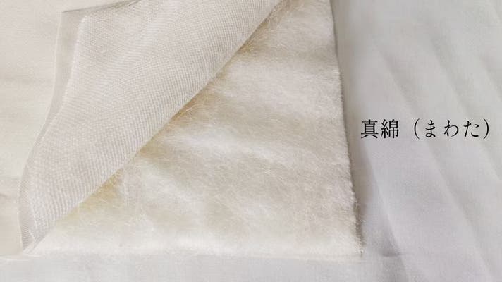 A: 真綿とは、蚕の繭から作られるシルク100%のわたのことです。繊維が長く空気を含むため、軽くてやさしく体に沿い、保温性と通気性を兼ね備えています。