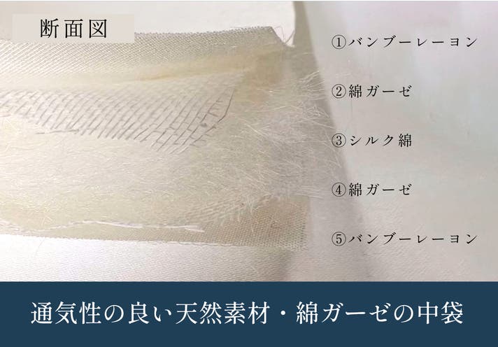 ◾️中袋には、通気性のよい綿ガーゼを採用。一般的に使われる不織布ではなく、天然素材の綿ガーゼを使用することで、仕上がりがふんわりとなり、よりやさしい肌触りと通気性を実現しました。