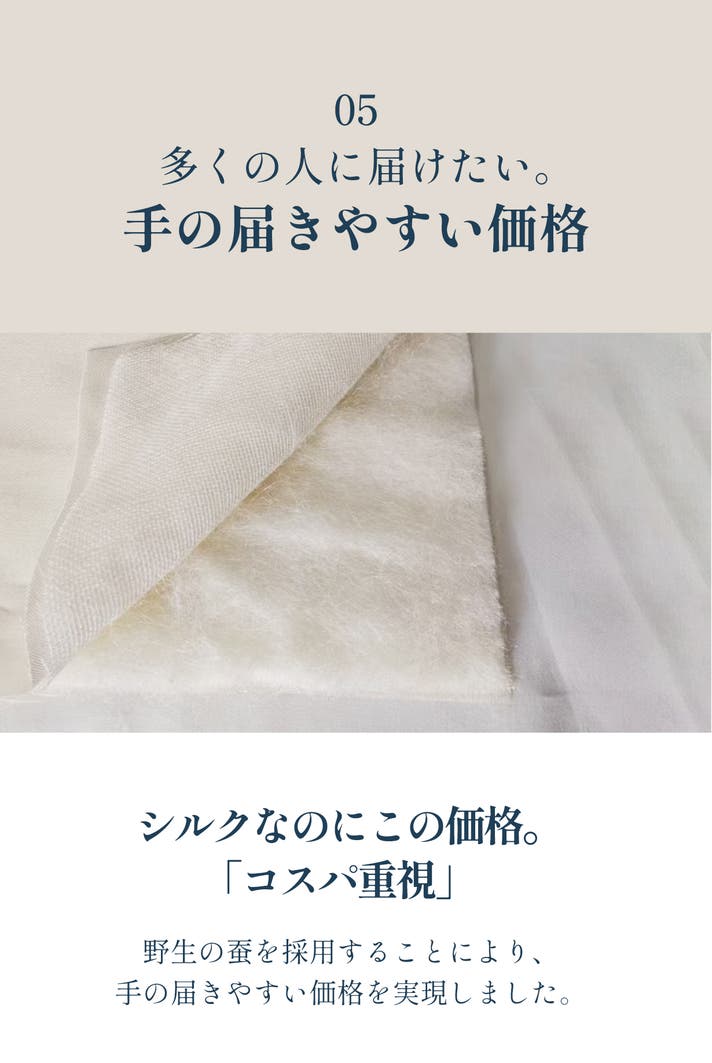 本製品の中綿には、家蚕ではなく野蚕のシルクを使用しています。野蚕は家蚕に比べて繊維がやや粗いため、直接肌に触れる織物にはあまり用いられません。しかしシルク自体の吸放湿性は変わらず、コストを削減できます。中綿としては十分な性能を持ちながら、より手の届きやすい価格を実現しています。