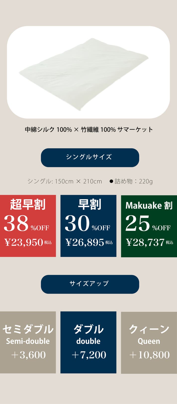 詰め物 : 中綿シルク 100% 220g(シングルサイズの場合)