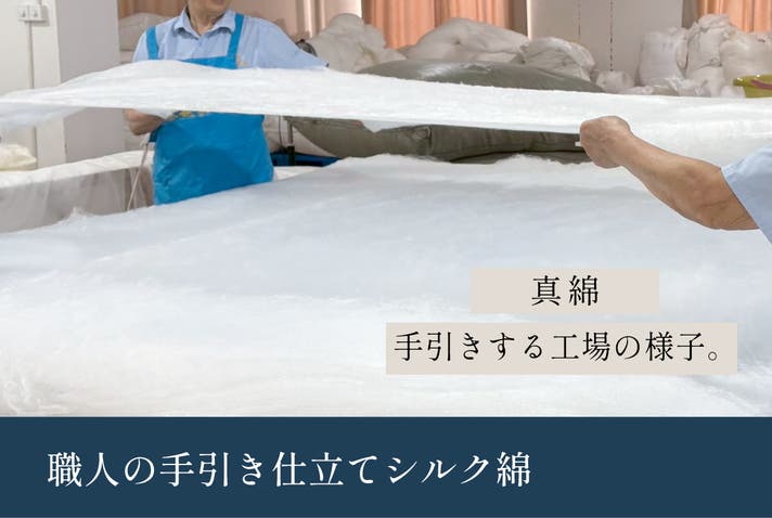 ◾️中綿は、職人による「手引き」のシルク綿を使用。機械引きではなく、丁寧に手で広げたシルクを重ねることで、ふんわりとした空気層が生まれ、やさしく身体に寄り添います。