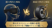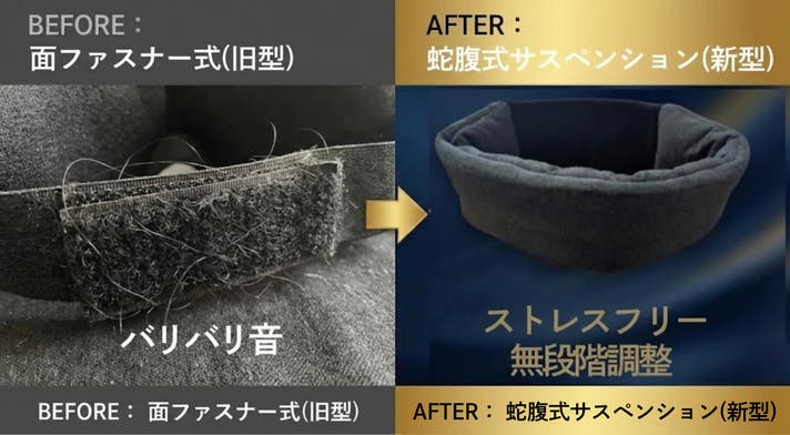 A. 大きな違いは「ノイズの徹底排除」と「独自のサスペンション構造」です。面ファスナーを廃止することで、装着時の音や髪への絡まりを解消しました。また、蛇腹構造が顔の形に合わせて圧力を分散するため、圧迫感のない異次元のフィット感を実現しています。