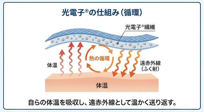 A. 自分の体温を利用して、心地よい温度をキープする高機能素材です。電気を使わずに、体温に近い自然なぬくもりを維持するため、蒸れにくく、一年中快適なコンディショニング環境を提供します。「熱すぎる」といった刺激ではなく、穏やかな温かさが特徴です。