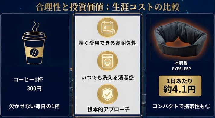 EYESLEEPは毎日使い、繰り返し洗っても耐えうるタフな設計。3年間共にするパートナーとして考えれば、1日あたりのコストはわずか「約4.1円」です。