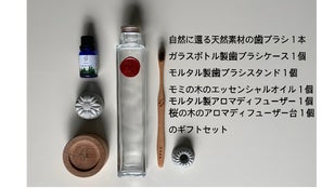 ・天然素材の歯ブラシ1本とガラスボトル歯ブラシ入れ1個とモルタル製歯ブラシ立て1個とモミの木の精油1個とモルタルと木のディフューザー各1個のセット