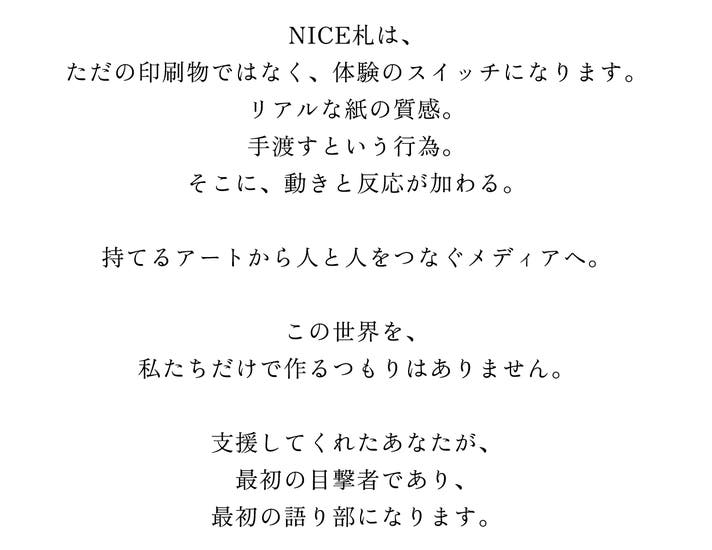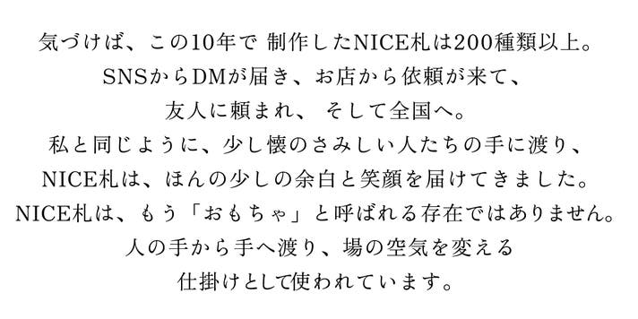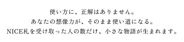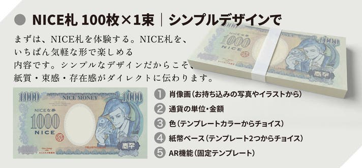 まずは、NICE札を体験する。NICE札を、いちばん気軽な形で楽しめる内容です。シンプルなデザインだからこそ、 紙質・束感・存在感がダイレクトに伝わります。