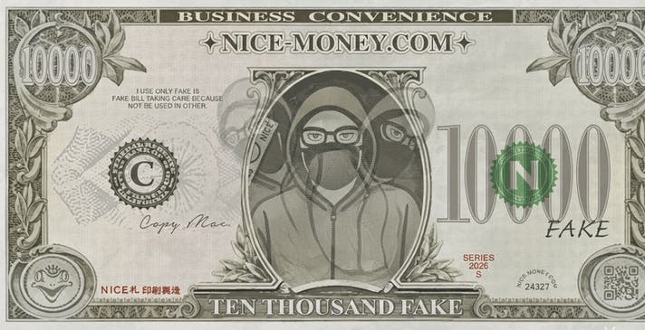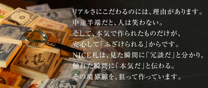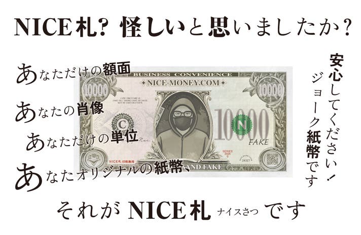 - 独自のジョーク紙幣「NICE札」の世界観の、あなたのオリジナル紙幣を作成