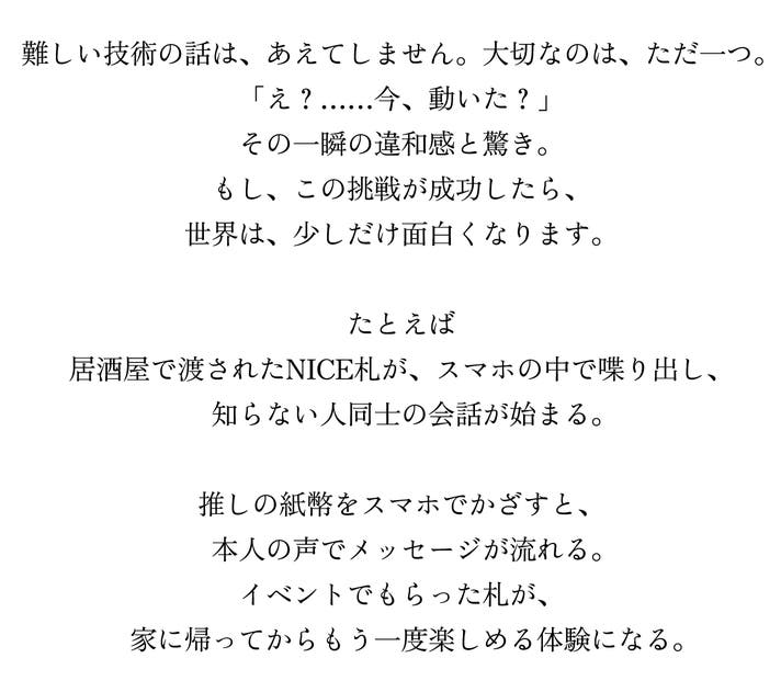 「Makuake(マクアケ)」は、実行者の想いを応援購入によって実現するアタラシイものやサービスのプラットフォームです。このページは、 アート・写真カテゴリの 「ジョーク紙幣NICE札が動く紙幣に進化して登場!肖像が動くAR機能搭載の紙幣」プロジェクト詳細ページです。