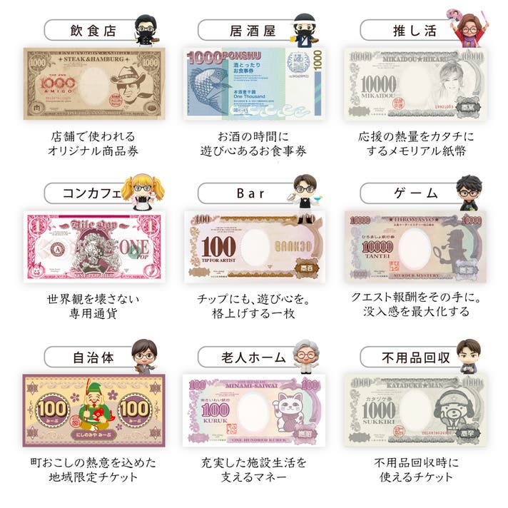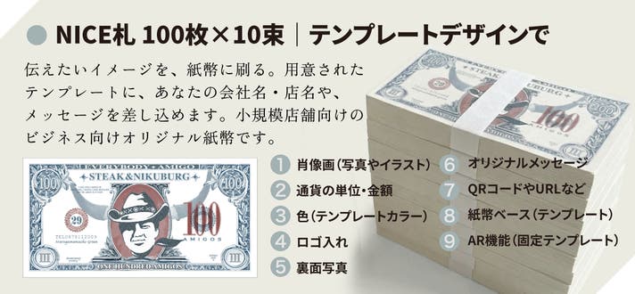 伝えたいイメージを、紙幣に刷る。用意されたテンプレートに、あなたの会社名・店名や、メッセージを差し込めます。小規模店舗向けのビジネス向けオリジナル紙幣です。