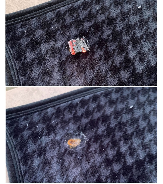 (実験方法)焚火で使用していた約3cm角の炭片を毛布に落とし、約30秒放置。