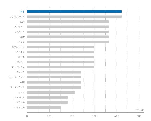 シドニー大学が行った「世界20か国における平日の総座位時間」の調査では、日本人の座位時間はサウジアラビアと並んで420分(7時間)と最長!家でも外でも座っている事が多く、長時間座りすぎています。