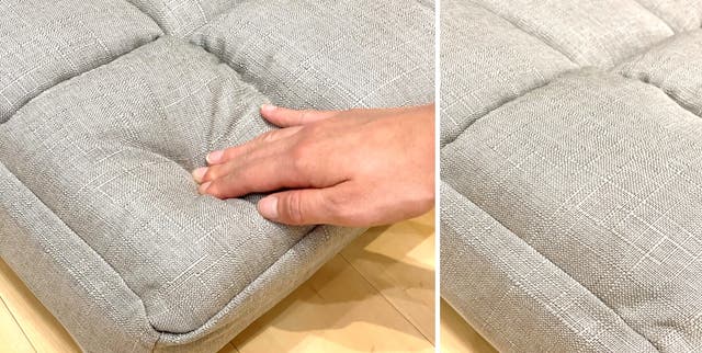 座面はしっかり、背面はふっかふかの感触が心地よい。くつろぎシーンに最適です。