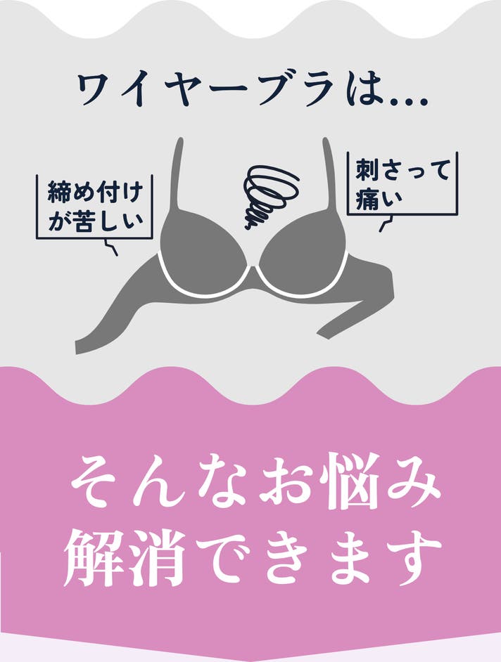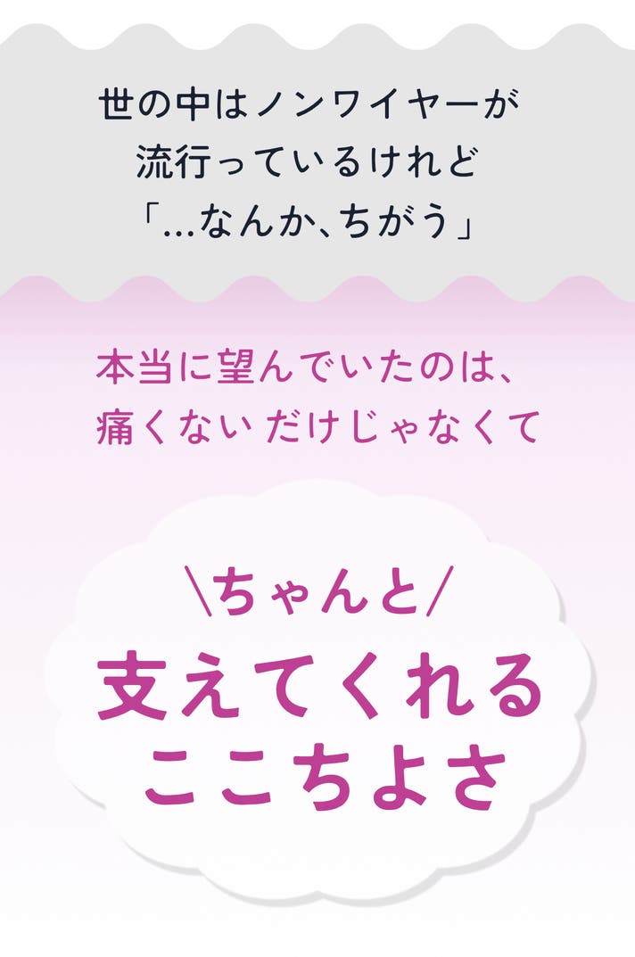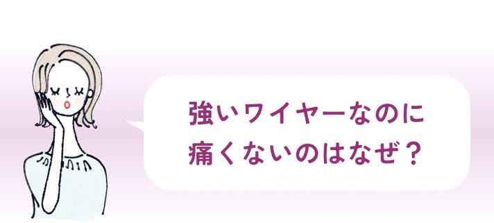 - 特許構造で、ワイヤーの締め付けや痛みなどのお悩みをフリーに。美しさと快適さを両立。